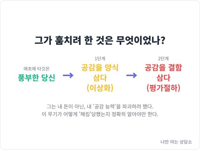 우선 우리가 이 무기를 되찾기 전에, 그것이 어떻게 ‘해킹’당했는지 정확히 알아야 합니다. 그는 당신의 공감 능력을 어떻게 당신을 공격하는 무기로 역이용했을까요?