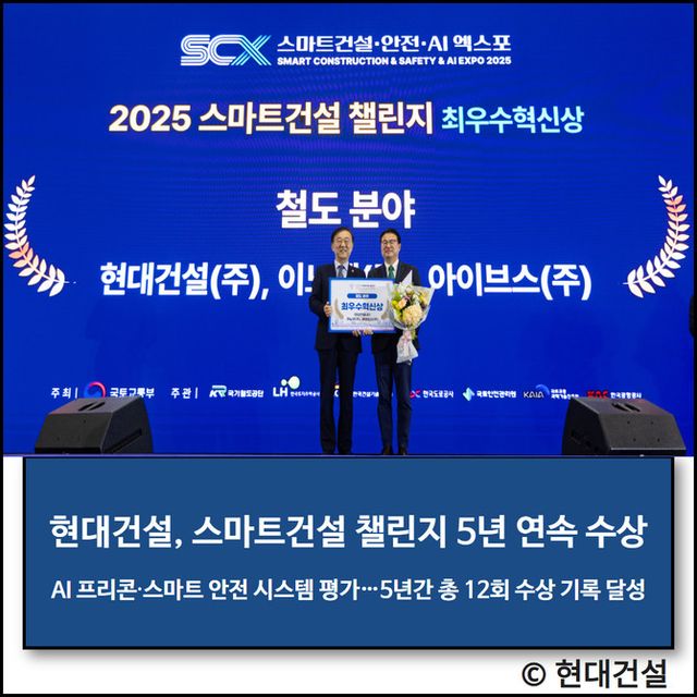 현대건설(000720)은 지난 5일 열린 '2025 스마트건설 챌린지'에서 BIM과 철도 분야 최우수 혁신상, 단지·주택 분야 혁신상 등 총 3개 부문을 수상했다고 7일 밝혔다. 이로써 현대건설은 5년 연속 수상 기록을 이어가며 국내 최고 수준의 스마트건설 기술력을 다시 입증했다.