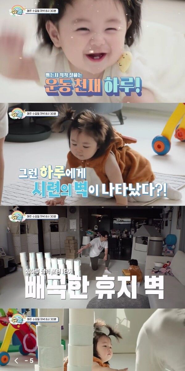 이날 심형탁은 점프, 축구, 수영 등 뭐든지 잘하는 하루를 위해 특별한 '인생 담력 훈련'을 준비했다. 그는 거실 한가운데 휴지로 만든 거대한 벽을 세웠고, 하루는 잠시의 망설임 없이 벽을 무너뜨리며 놀라운 용기를 보여 심형탁의 감탄을 자아냈다.