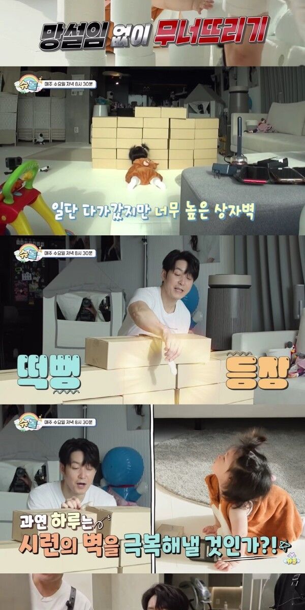 심형탁은 "우와, 우리 하루 정말 짱짱맨이다"라며 기뻐했지만, 이어 난이도를 훨씬 높인 **'상자 벽'**을 두 번째 장애물로 설치했다. 하루가 상자 벽 앞에서 잠시 주춤하는 모습을 보이자, 심형탁은 비장의 무기인 '떡뻥'을 꺼내 들며 아들을 격려했다. 과연 하루가 '시련의 벽'을 극복할 수 있을지 귀추가 주목된다.