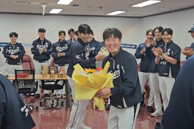 류지현 감독은 9일 서울 고척스카이돔에서 열리는 2025 K-베이스볼 시리즈 체코와의 2차전을 앞두고 가진 선수단 미팅에서 선수들에게 깜짝 파티를 받았다.