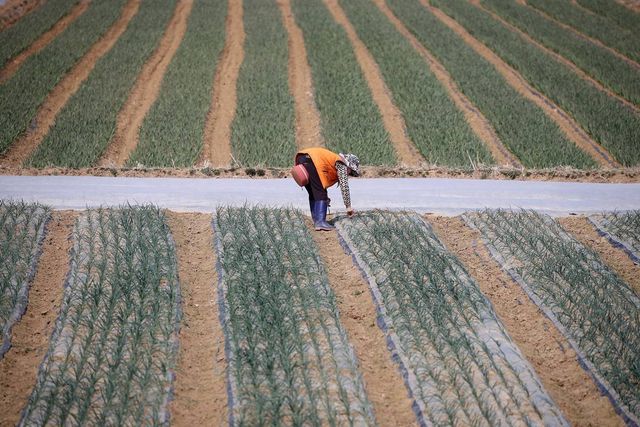한 할머니가 겨우내 보온 비닐 아래서 싹을 틔운 양파 싹을 뽑아 올리고 있다