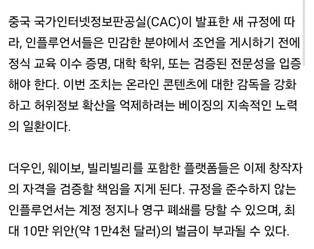 앞으로 중국내 인플루언서가 특정 민감 분야에 대해 발언하려면 그 분야 정식교육 이수 과정 증명서와 대학 학위등 전문성 입증이 필요됨.