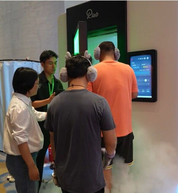 ‘기술로 인간의 노화를 막을 수 있다’고 주장하는 상하이 기업 알랩(Rlab)은 전화 부스처럼 생긴 영하 200도까지 온도를 낮추는 극저온 장치를 소개했다. 한 이용객이 들어갔다가 몇 초 만에 추위에 뛰쳐나오기도 했다.