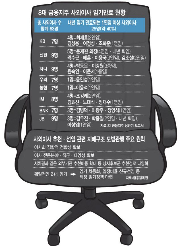 9일 이데일리가 각 금융지주 상반기 보고서를 분석한 결과 8대(KB·신한·하나·우리·NH·iM·BNK·JB) 금융지주의 사외이사는 총 63명으로, 이 중 내년 3월 주주총회에서 임기가 끝나는 연임(중임) 이상의 사외이사는 25명이다. 전체 사외이사의 40%에 달하는 것이다. 회사별 사외이사 현황을 보면 KB금융지주의 최재홍 이사는 지난 2022년 3월 25일 최초 선임된 후 2연임을 하고 내년 3월 주주총회에서 임기가 끝난다. 김성용·여정성·조화준 이사는 1연임 후 내년 임기 만료를 앞두고 있다.