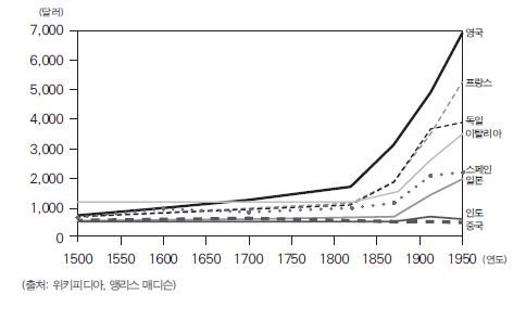 그러나 도표에서 보듯이 1820년에 영국을 중심으로 서유럽 국가들의 급격한 경제성장이 시작되고 있음을 시각적으로 분명하게 보여주고 있다. 그래서 많은 학자가 1820년대를 대분기Great Divergence라한다.