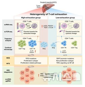 이번 연구의 제1저자인 이순규 교수는 "같은 간암이라도 환자마다 종양 면역 미세환경이 다르며, T 세포의 탈진 정도에 따라 유전자 변이 패턴과 바이러스 통합 정도가 다르다는 것을 규명했다"고 연구 의미를 설명했다.
