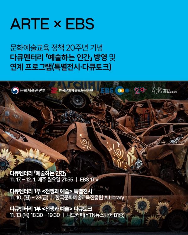 전시 기간 중인 11월 13일 오후 6시 30분에는 서울 마포구 상암동 YTN뉴스퀘어 지하 1층에서 ‘다큐토크’가 마련된다. 이번 자리는 전쟁과 예술, 인간의 일상을 매개로 예술이 존재해야 하는 이유를 함께 나누는 대화의 장으로, 참여 신청은 한국문화예술교육진흥원 누리집을 통해 가능하다.