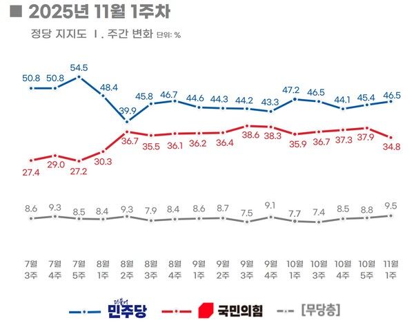 정당 지지율 조사에서 더불어민주당이 2주 연속 상승한 가운데 국민의힘은 하락하면서 양당 격차가 10%P대로 벌어졌다. 10월 첫 주 차에서 11.3%P차를 보인 후 약 한달 만이다.