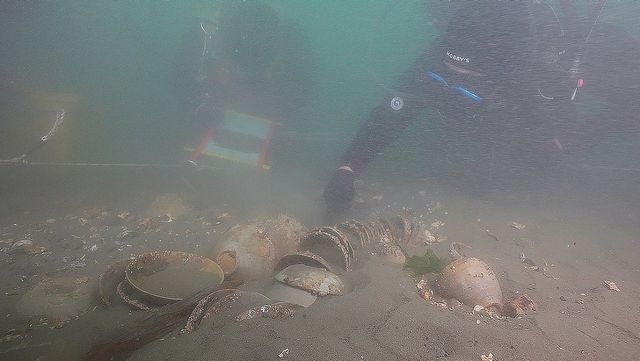 국립해양유산연구소는 태안 마도 해역을 조사하던 중 곡물과 도자기를 운반하다가 침몰한 것으로 추정되는 고(古)선박의 흔적을 찾았다고 10일 밝혔다. 마도 해역은 서해의 뱃길 중에서도 예부터 험난하기로 손꼽힌다. 사진은 청자 다발을 확인하는 조사원들. / 국립해양유산연구소
