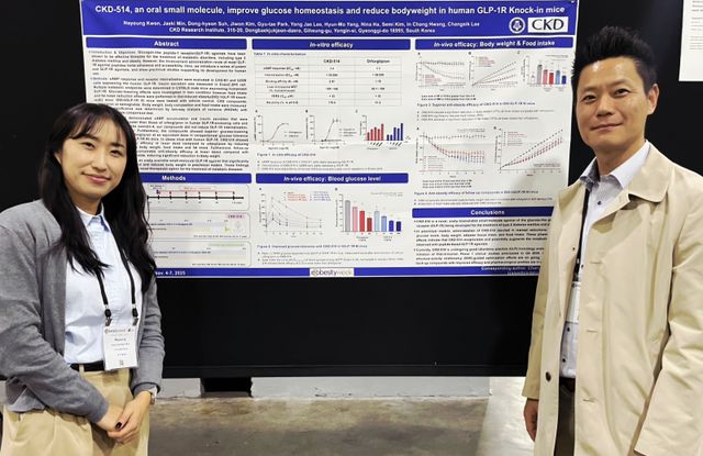 지난 4일 미국 애틀란타에서 열린 ‘2025 미국비만학회’(2025 Obesity Week)에서는 경구용 GLP-1 수용체 작용제(GLP-1RA) 신약 후보물질 CKD-514의 비임상 연구 성과를 발표했다. CKD-514는 용해도 개선을 통한 구조적 이점을 바탕으로 대동물 모델에서 우수한 경구 생체이용률(Dog BA)을 보였으며, 경구용 비만치료제 오포글리프론(Orforglipron) 대비 적은 용량에서 유의한 체중 감소 효과와 동일 용량 대비 우수한 혈당 강하 효과를 나타냈다. CKD-514의 후속 화합물군 역시 오포글리프론과 세마글루타이드(Semaglutide)와의 비교 시험에서 두 약물과 동등하거나 우월한 대사 개선 효과가 있음을 확인했다. 복용 편의성이 높은 경구 제형 비만치료제 개발에 성공한다면 주사형 비만 치료제가 주류를 이루는 글로벌 시장에서 차별성과 경쟁력을 확보할 것으로 기대된다.