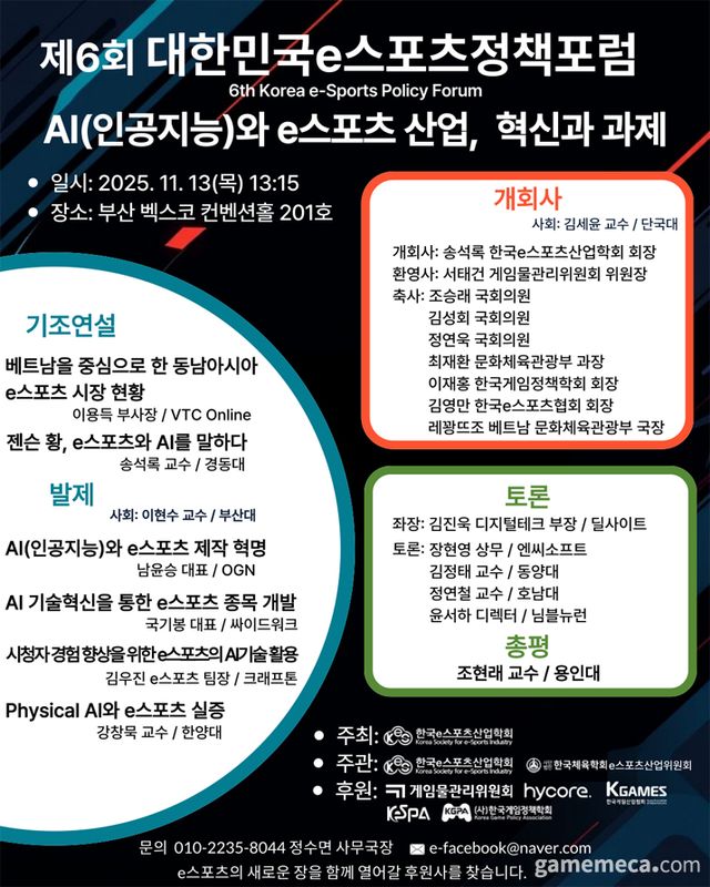 이번 포럼은 'AI(인공지능)와 e스포츠 산업, 혁신과 과제'를 주제로, 인공지능이 e스포츠 생태계 전반에 가져올 기술적·산업적·정책적 변화를 이해하고 논의한다.