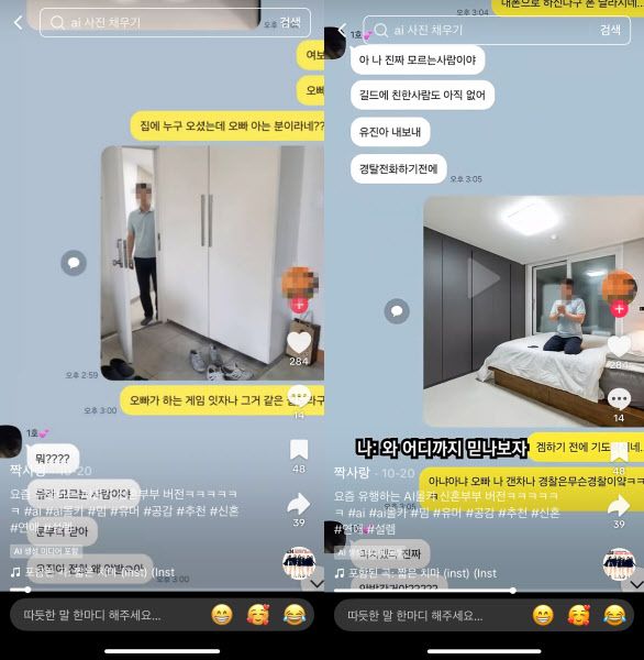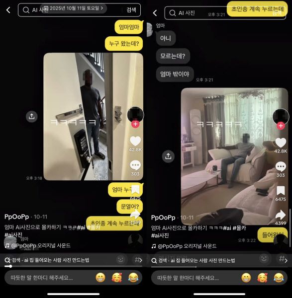 신혼부부 사이의 AI 장난 콘텐츠도 등장했다. 한 틱톡 이용자는 현관 앞에 낯선 남성이 서 있는 모습을 AI로 합성한 뒤, “오빠가 아는 사람이라고 해서 문을 열어줬다”는 메시지를 남편에게 보냈다. 이에 남편은 모르는 사람이라며 “당장 문부터 닫아라”, “왜 전화를 받지 않느냐”며 다급한 반응을 보였다. 이후 이용자가 거실·안방 등 집 곳곳에 낯선 인물이 등장하는 합성 사진을 연이어 보내자 남편은 “경찰에 신고하기 전에 내보내라”, “회사에서 막 출발하려고 한다”는 다급한 메시지를 남겼다.