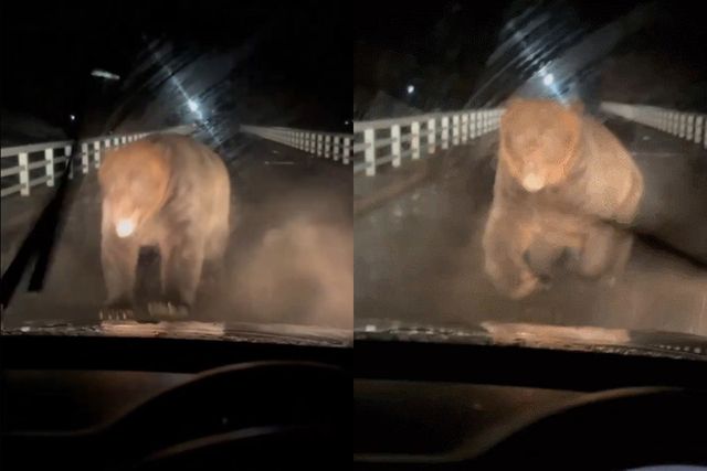 운전자가 차량 안에서 휴대전화로 촬영한 영상에는 비가 내리는 어두운 도로 위로 불곰 한 마리가 빠른 속도로 차량을 향해 돌진하는 장면이 담겼다.