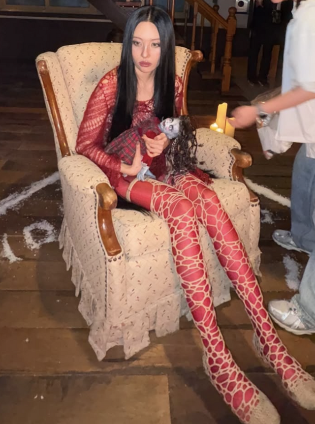 공개된 사진 속 선미는 붉은색 전신 레이스 타이즈와 시스루 톱을 매치해 독특한 질감의 의상을 완성했다. 거미줄을 연상시키는 타이즈 패턴이 다리를 따라 촘촘히 이어지며, 인형을 품에 안은 포즈와 어우러져 묘한 긴장감을 자아낸다.