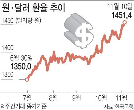 이처럼 내국인의 해외투자가 크게 늘어난 상황에서 외국인의 국내주식 순매도까지 가세하면 환율 상승 속도는 더욱 가팔라질 수 있다. 실제로 지난주 외국인이 코스피 시장에서 7조원 이상을 팔아치우자 환율은 7개월 만에 1460원대로 올라섰다.
