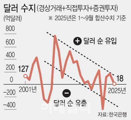 이민혁 KB국민은행 이코노미스트는 “이미 현대차 등 민간 기업들도 대미투자를 확대하며 늘리고 있는 추세여서 직접투자 측면에서도 달러가 많이 빠져나갈 것”이라며 “내년 기관 전망을 보면 관세 효과가 가시화되면 수출이 꺾이면서 경상흑자 폭도 줄어들 수 있는데, 계속해서 직접투자가 늘어난다는 가정에서 보면 달러수지는 적자로 갈 수 있다”고 전망했다.