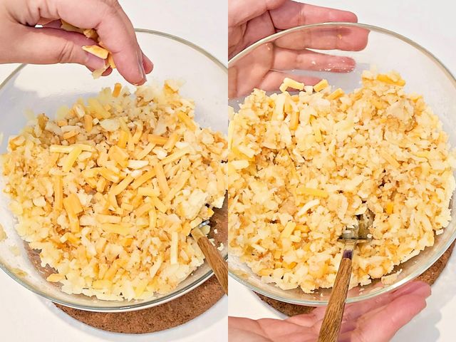 으깬 해시브라운에 모짜렐라 치즈를 넣어 고루 섞어주세요.