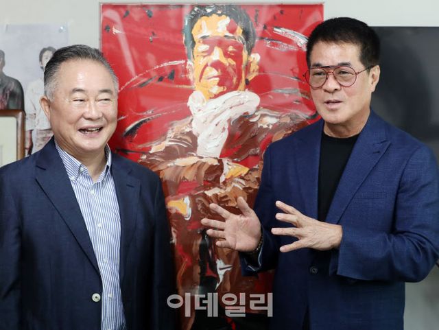 [대담=예종석 명예대기자(한양대 명예교수)·정리=이지현 기자] “배경에 맘마미아 포스터가 있으면 좋겠습니다.” 사진기자의 한 마디에 한국 공연계를 이끌어온 박명성( 63) 신시컴퍼니 예술감독은 맨손으로 박스테이프를 쩍 뜯어내 테이블에 놓였던 맘마미아 포스터를 TV에 붙였다. 그의 행동은 가위를 찾으러 간 직원보다 빨랐다. 무대에서 40여 년간 궂은 일을 도맡다 보니 이건 일도 아닌듯싶었다. 그는 다시 무심한 표정으로 포즈를 취했다.