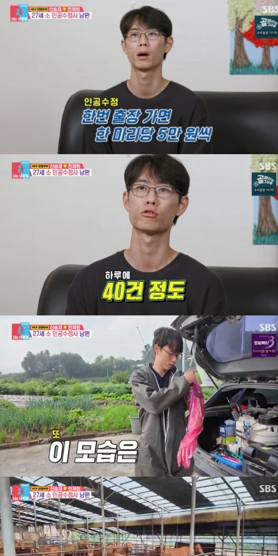 신승재는 "(가축인공수정사를 하면) 나중에 도움이 되지 않을까 해서 대학교 때 자격증을 따놨다. 그리고 결혼 후에 아이가 태어나면서 부업을 하기 시작했다. 인공수정은 출장을 가면 소 한 마리당 5만원을 받는다"고 설명했다.
