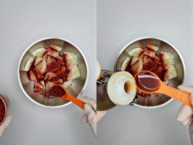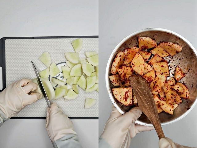 고춧가루2큰술, 매실액1큰술(무 1kg 기준)을 넣어 잘 버무려주세요.
