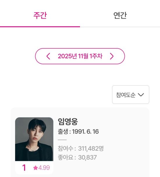 최근 아이돌차트에 따르면 지난 11월 3일부터 11월 9일까지 집계된 평점랭킹에서 임영웅은 311,482표를 얻어 최다득표를 기록했다.