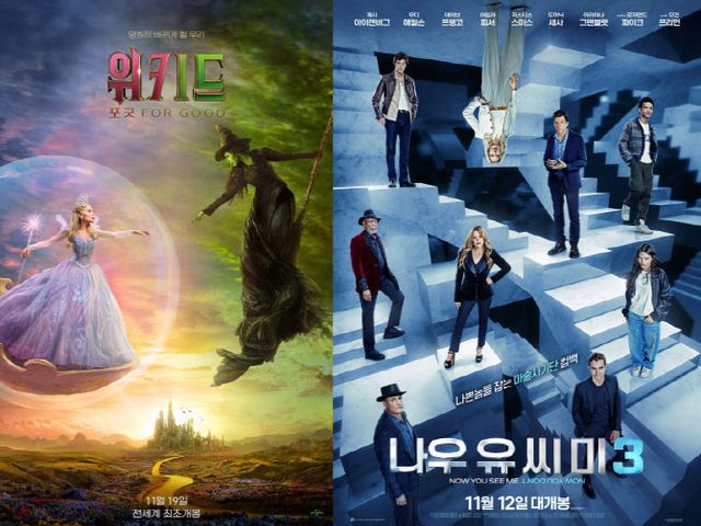 ‘나우 유 씨 미’는 눈으로 보고 있어도 믿을 수 없는 화려한 마술 트릭으로 전 세계를 사로잡았던 인기 블록버스터 시리즈다. 시리즈 합산 월드 와이드 흥행 수익이 6억 8662만 달러(약 9610억 원)를 기록했다. 한국에서도 시리즈 2편 합쳐 관객수가 570만 명을 넘으며 인기를 끌었다. 이번 3편 역시 시리즈 원년 멤버들이 총출동해 반가움을 자아내고 있는 만큼 ‘위키드: 포 굿’ 개봉시기에 앞서 흥행 청신호를 쏘아올릴 수 있을지 눈길을 끈다.