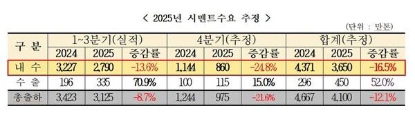 올해 시멘트 내수 출하량이 34년 만에 가장 낮은 수치를 기록할 것으로 전망된다.