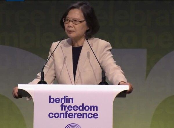 퇴임 이후에도 활발한 대외 활동으로 ‘전 총통 외교’를 펴고 있는 차이잉원 전 총통이 10일 독일 베를린에서 열린 ‘베를린 자유회의’에서 연설했다. 연설 주제는 ‘민주 국가들이 직면한 위협: 자유 수호에 있어 대만의 경험’.