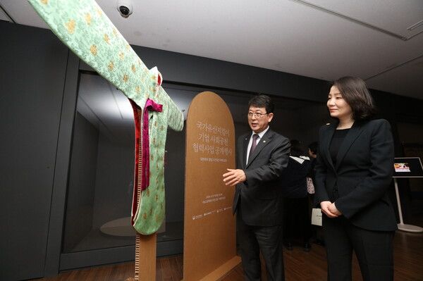 최응천 국가유산청장(왼쪽)과 이홍주 LG생활건강 상무(오른쪽)가 지난 4월 서울 국립고궁박물관에서 열린 ‘조선 왕실, 대한제국 황실 국가유산 복제 성과 공개 행사’ /LG생활건강 제공