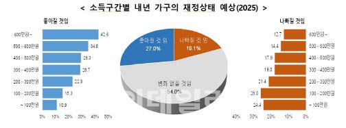 조사 결과를 보면 19세 이상 가구주 중 내년 가구의 재정상태가 ‘좋아질 것’이라는 응답률은 27.0%로 집계됐다. 2011년 관련 통계 조사 이래 가장 높은 수치다. 이 조사 결과는 2011년 25.0%로 시작해 20%를 웃도는 수준에서 부침이 있었고 2년 전엔 25.7%였다. 데이터처 관계자는 “2017년 26.5%를 기록한 적 있지만 올해가 가장 높은 수치”라며 “가구주의 연령대가 낮을수록, 가구의 월 평균소득이 높을수록 내년 가구의 재정상태에 대해 낙관적인 경향을 보였다”고 분석했다.