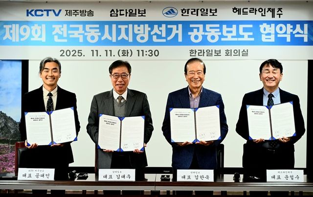 제주 언론 4사는 11일 오전 한라일보 회의실에서 김한욱 한라일보 대표와 김대우 삼다일보 대표, 공대인 KCTV제주방송 대표, 윤철수 헤드라인제주 대표 등이 참석한 가운데 '제9회 전국동시지방선거 공동보도 협약식'을 개최했다.