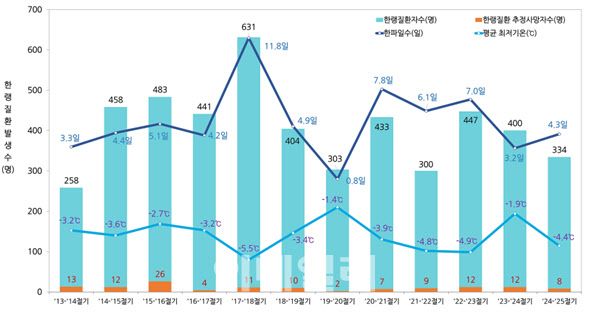 11일 질병관리청에 따르면 한랭질환 응급실감시체계를 통해 2024년 12월부터 2025년 2월까지 집계된 한랭질환자 수는 334명이었다. 이 중 사망자는 8명이었다. 이는 전년(한랭질환자 400명, 추정 사망 12명 포함) 대비 16.5% 감소(한랭질환자 발생 건수)한 수치다.