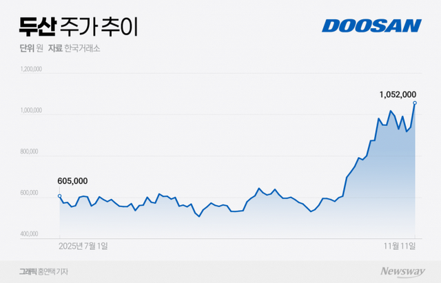 11일 두산 주가 전일 대비 9.48% 상승, 52주 신고가 경신