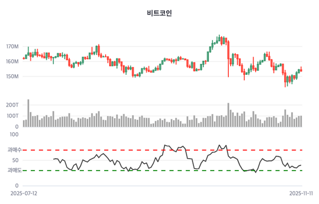 한편 비트코인 가격은 하락 중이다. 코인마켓캡에 의하면, 비트코인은 이날 오후 3시 30분 현재 153,587,680원에 거래 중이다. 156,638,368원을 최고점을 찍고 0시 대비해서는 858,896원(-0.56%) 하락한 가격이다.
