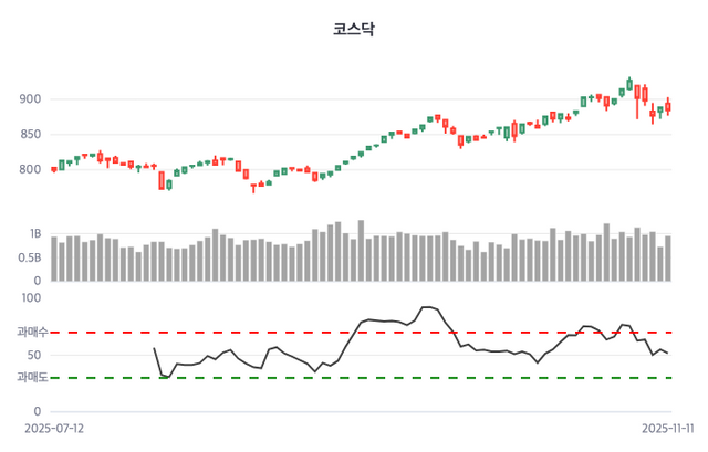코스닥 지수는 이날 893.91에 출발해 903.09를 고점으로 기록한 뒤 884.27로 거래를 마쳤다. 전거래일 대비 4.08포인트(-0.46%) 하락했고, 시작가보다는 9.64포인트(-1.08%) 하락했다.