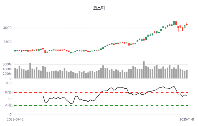 | 한스경제=김도현 기자 | 11일 코스피는 전거래일보다 0.81% 상승 마감했다. 한국거래소에 의하면 코스피 지수는 이날 오전 09시 4124.3에 개장해 장중 4187.46을 고점 기록한 후 오후 3시 30분 4106.39로 상승 마감했다. 전거래일 대비 33.15포인트(0.81%) 상승했으며, 이날 시작가 대비해서는 17.91포인트(-0.43%) 하락한 것이다.