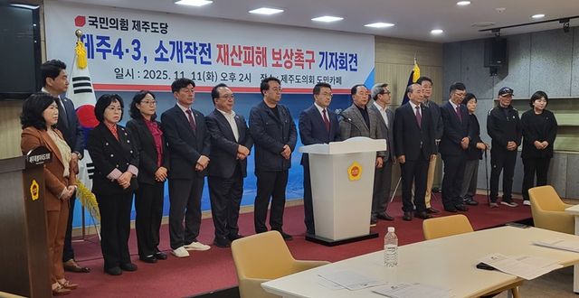 국민의힘 제주도당이 11일 제주도의회 도민카페에서 기자회견을 열고 4·3 소개작전의 재산피해를 국가가 보상해야 한다는 주장을 내놓았다. 오소범기자