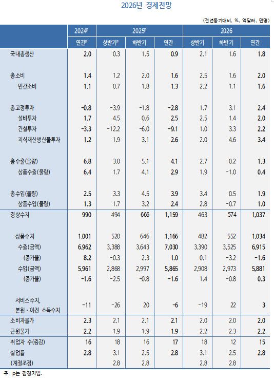 반면 수출은 올해 4.1%에서 내년 1.3%로 둔화할 것으로 봤다. 정 실장은 “선제적 수출 효과가 축소되는 가운데 미국 관세 인상의 부정적인 영향이 본격적으로 파급되면서 수출 실적이 둔화할 것”이라며 “다만 교역 조건이 개선되면서 경상수지는 내년에도 1040억 달러 내외의 대규모 흑자 추세를 지속할 전망”이라고 했다.
