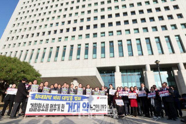 국민의힘은 11일 오전 서울 서초구 대검찰청과 과천 법무부 청사를 잇따라 방문해 항소 포기 결정에 항의하며 이 대통령, 정 장관, 노만석 검찰총장 직무대행의 사퇴를 요구했다. 장동혁 대표는 대검 앞에서 “단군 이래 최대의 개발 비리 범죄가 일부 무죄가 선고됐고, 8000억짜리 개발 비리가 400억으로 둔갑됐음에도 검찰은 항소를 포기했다”며 “검찰이 800억 범죄수익을 확보했음에도 그 돈을 범죄자에게 돌려주라고 하는 나라가 됐다”고 목소리를 높였다.