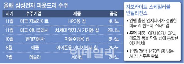 최근 삼성전자는 첨단 공정을 중심으로 파운드리 계약 낭보를 전하면서 고객사 확보에 성과를 내고 있다. 지난 7월에는 테슬라, 8월에는 애플 등 빅테크 기업들과 2나노 계약을 맺었다. 이외에도 국내 AI 팹리스 기업 딥엑스, 자율주행 반도체 기업 암브렐라, 일본 AI 기업 프리퍼드 네트웍스(PFN) 등의 2나노 수주를 따냈다. 최근에는 미국 AI 프로세서 스타트업 아나플래시와 28나노 공정을 활용해 임베디드 플래시 기술을 적용한 AI 기기용 마이크로컨트롤러유닛(MCU)을 만들고 있다.
