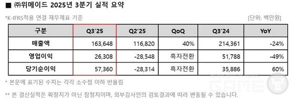 위메이드는 이번 3분기 매출 1,636억원, 영업이익 263억원을 기록했다고 발표했다. 매출은 전 분기 대비 약 40%가량 증가했고 ‘미르의 전설 2, 3’ 중국 라이선스 매출이 상승하며 3분기 실적을 견인한 것으로 나타났다.