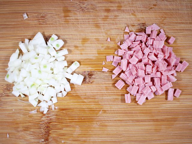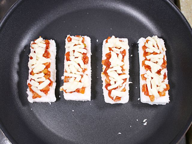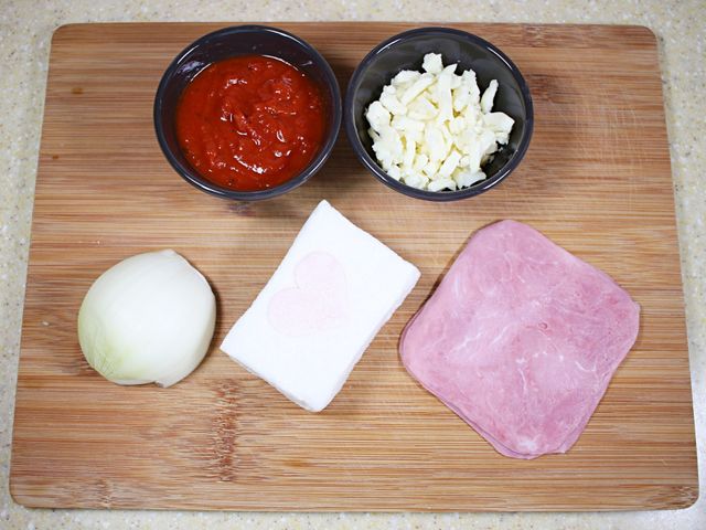 재료는 백설기, 양파, 햄, 토마토소스, 치즈 준비했어요.