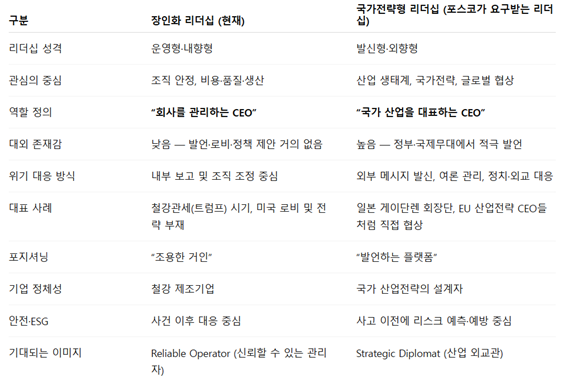 그러나 경영은 안정되었지만 존재감은 사라졌다. 포스코가 조용한 거인으로 남아 있는 동안, 세상은 이미 다음 단계로 이동하고 있다. 국가전략기업의 리더십은 보고서 안에서 존재하는 것이 아니라, 발언과 행동으로 존재해야 한다.