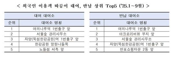 외국인 이용이 많은 대여·반납 장소는 여의나루역(영등포구), 서울숲 관리사무소(성동구), 뚝섬한강공원 자양역(광진구) 등 도심 대표 여가·관광지였다.