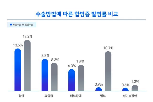 합병증 증상에 대한 분석결과 요실금은 수술방법에 따라 큰 차이를 보이지 않았으나, 로봇수술의 경우 배뇨장애 합병증 발병률은 일반수술보다 1.3% 낮게 나타나고 혈뇨는 거의 확인되지 않았다.
