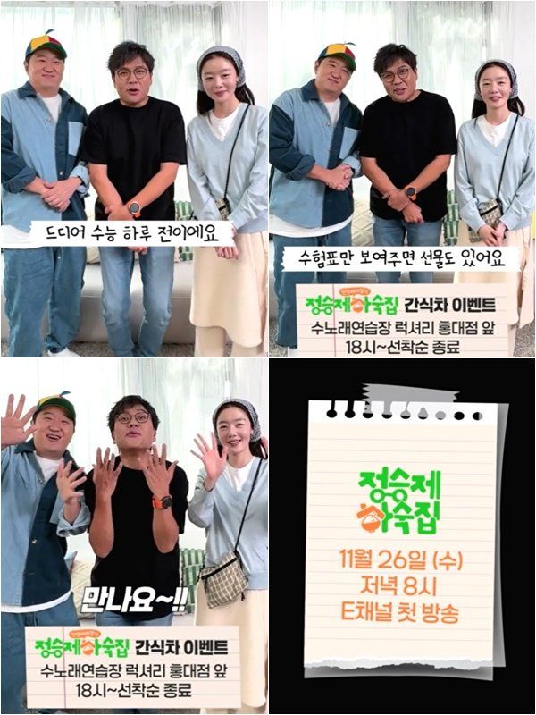 세 사람은 “수능이 끝나는 내일 저녁, 홍대 레드로드에서 ‘정승제 하숙집 간식차 이벤트’가 열린다. 수험표를 보여주면 선물도 주니까 꼭 들러 달라”며 밝은 미소로 격려를 전했다. 이어 “인생도 맛도 다 때려잡는 ‘정승제 하숙집’에서 만나요!”라며 본방 사수도 잊지 않았다.