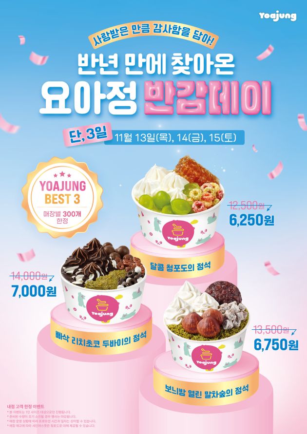 요아정이 고객들의 꾸준한 성원에 보답하고자 연 최대 할인 행사인 ‘반갑데이’를 11월에 진행한다. 이번 프로모션은 브랜드의 대표 메뉴 3종을 절반 가격에 제공해 프리미엄 디저트를 보다 합리적인 가격에 즐길 수 있는 기회를 마련했다.