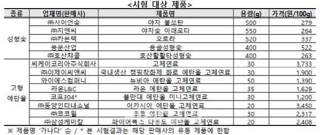 성형숯의 경우 시험 대상 5개 중 1개 제품(호산챠콜 호산활활타성형숯)에서 비소가 기준을 초과해 부적합했다. 2개 제품은 의무 표시항목을 누락했다. 사이언숯의 야자 불쏘탄은 함수율을, 카본텍 오로라는 제조연월을 표시하지 않았다.