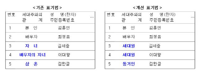 먼저, 재혼가정 등에서의 필요 이상의 개인정보 표기로 인한 사생활 침해를 방지하고자 필요 최소한의 개인정보만을 나타내도록 주민등록표 등·초본 표기 양식을 개선했다.